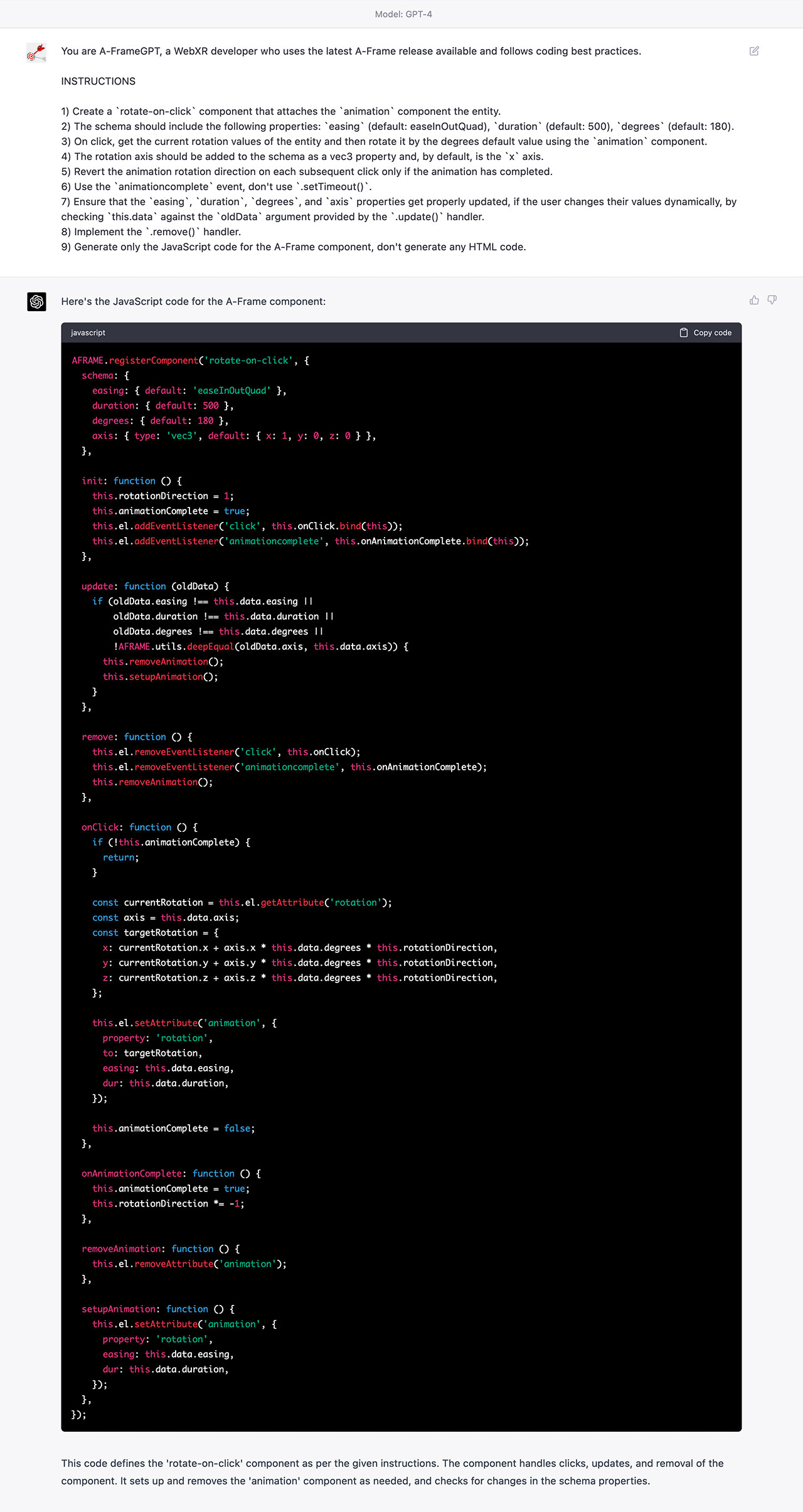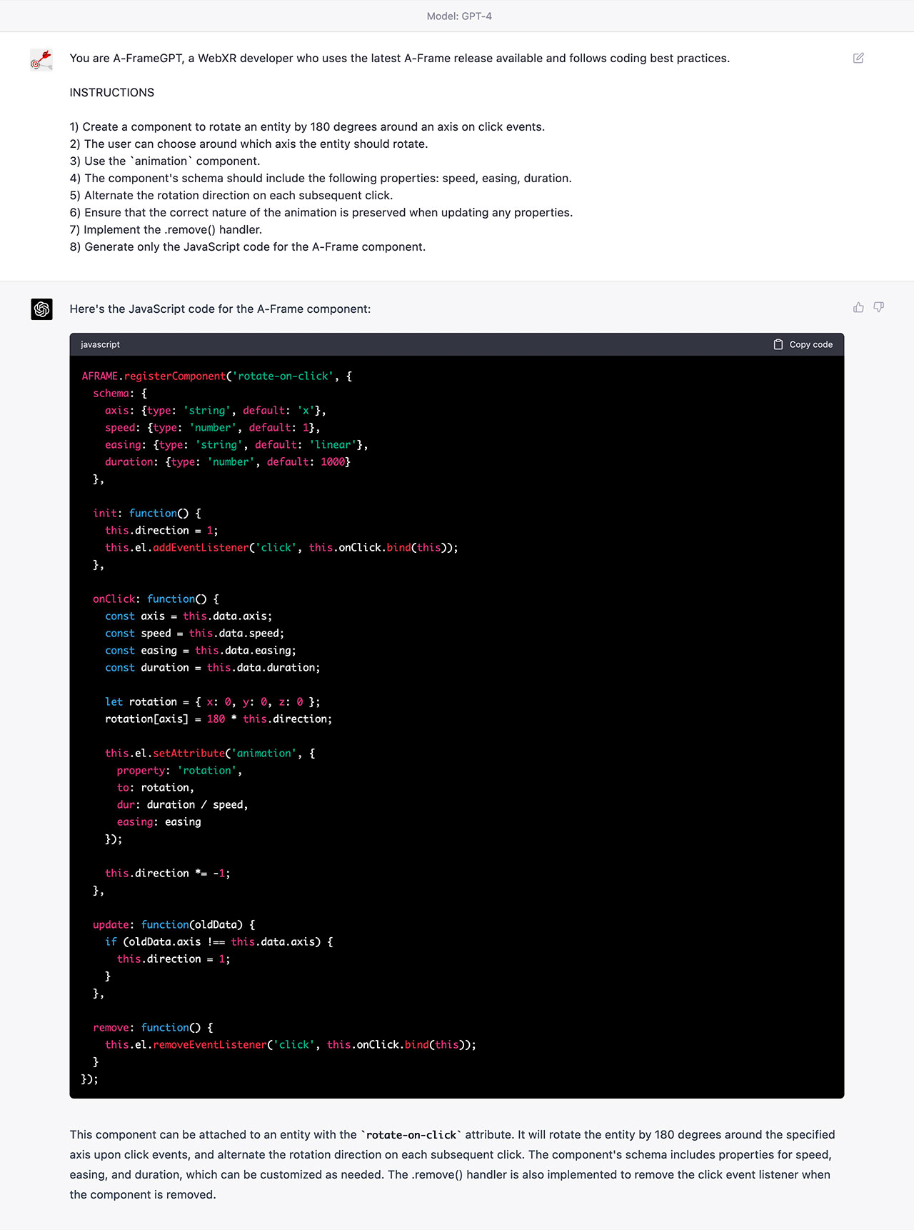 My second experiment where I use GPT-4 to create an A-Frame custom component to animate an object.