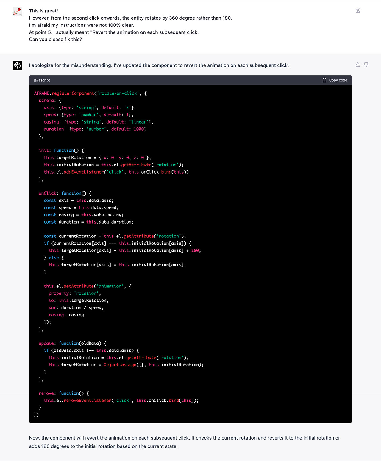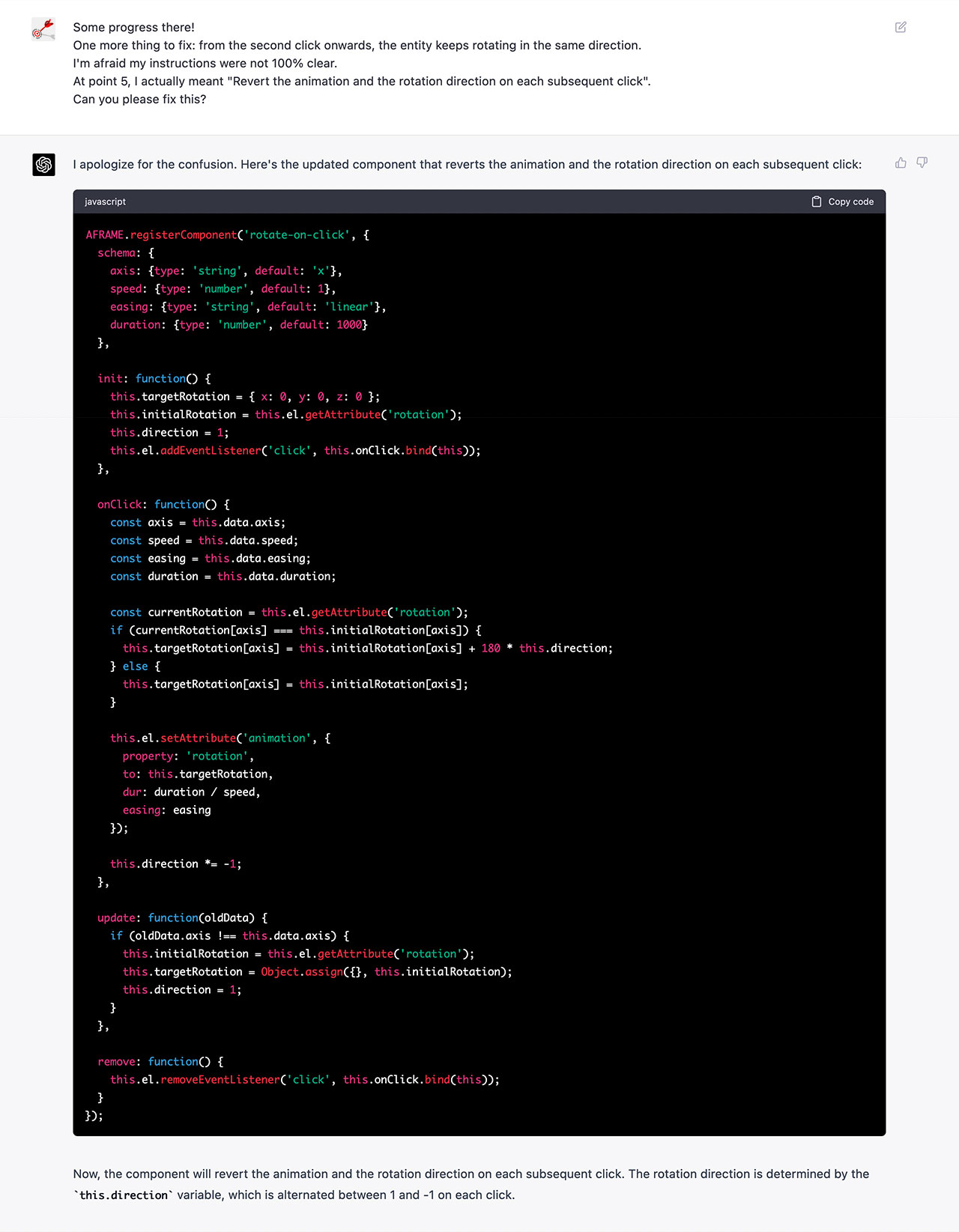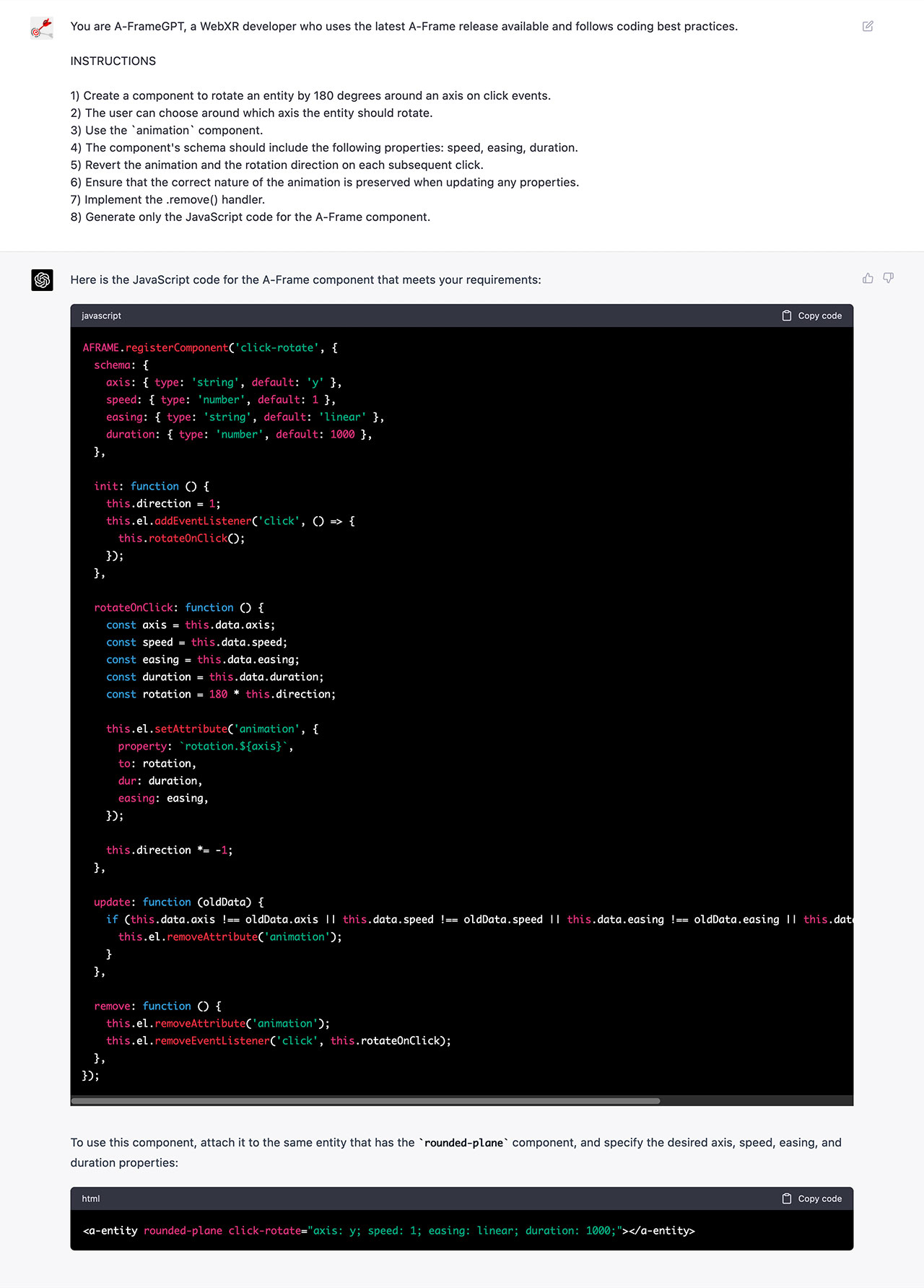 The below video shows the final version of the click-to-rotate component I generated with GPT-4, which allows to click an object and rotate it around an axis by using the A-Frame built-in animation component; then, on each subsequent click, the rotation direction is inverted.